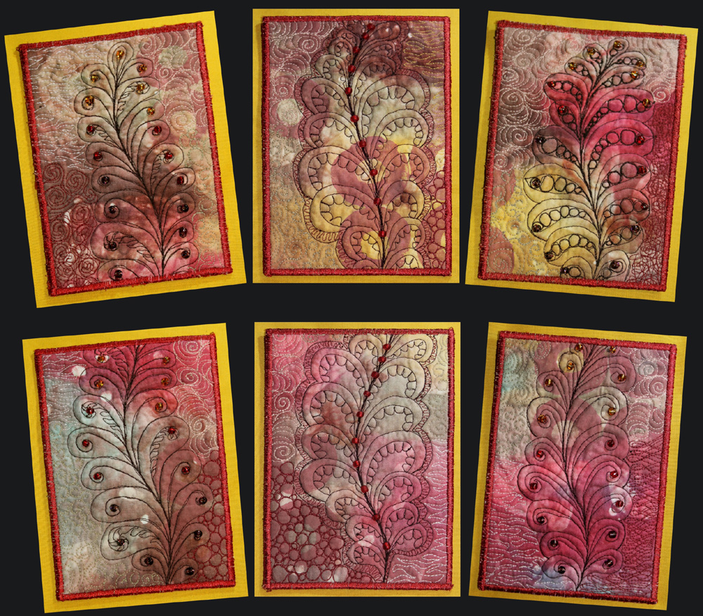 Danach habe ich die Federn ausgeschmückt und den Hintergrund mit diversen unterschiedlichen Garnen eng gequiltet. Daraus wurden die sechs Rechtecke für die Karten etwas großzügig ausgeschnitten und mit einigen kleinen Glasperlen bestickt.